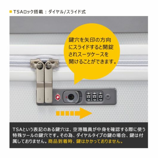 備考 |※このスーツケースのTSAロックはダイヤルコンビネーションロックです。鍵穴は、TS職員が緊急の際に解錠して検査を行うためのものであり、差し込み式のキーは付属しておりません。
