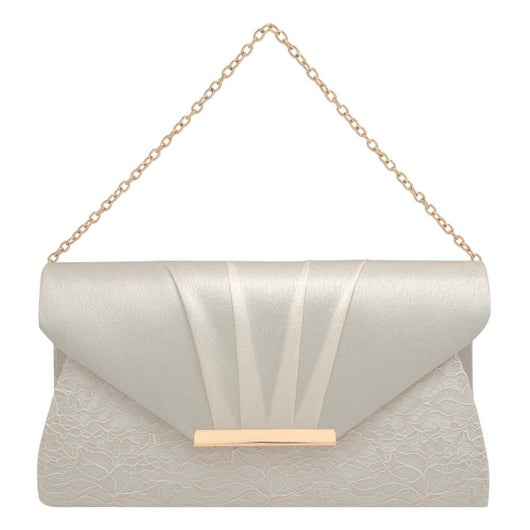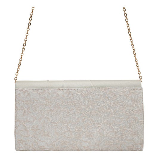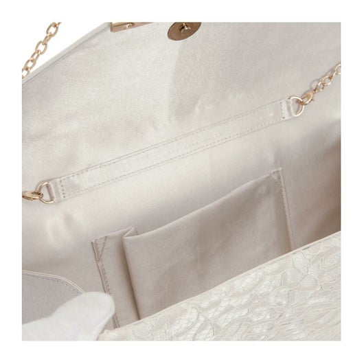 本体部分にレース生地、フラップ部分にサテンを用いたコンビネーションが特徴的なデザインのパーティーバッグです。クラッチバッグとして持っていただけ、さらには長短2種類のチェーンストラップが付いており肩掛けワンショルダー、斜め掛けと2通りの持ち方も楽しんでいただけます。