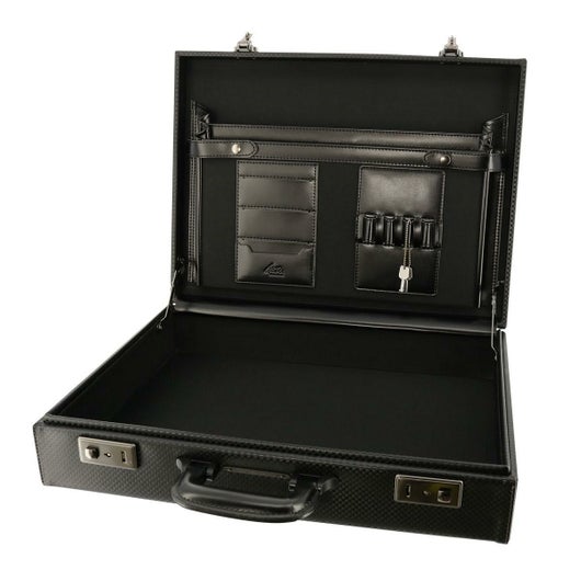 合成皮革でありながら、カーボン調のイメージを醸し出している本体素材を使用。また、ケースの箱枠には軽さと強度を両立させた合板を使用しています。現在、日本製のアタッシュケースは、弊社工場を含め数社しか生産できません。