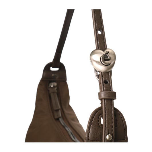 ハートのストッパー飾りがポイントのナイロン製ホーボーバッグ。シンプルなフォルムで、背負ったときに自然に折りたためるチャーミングなフォルムが魅力となってます。ストラップはストッパーとドローストリングのディテールで調節可能です。