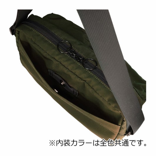 デイリーユースに活躍するコンパクトサイズのショルダーバッグです。500mlのペットボトルも横向きに収納でき、全面にもファスナータイプのポケットが備わっているので、普段使いはもちろん旅行時にもぴったりなアイテムになっています。メインルームにはポケットを備えているので小物の整理もしやすくなっています。また、ハンドタオルや財布、ポーチなど普段使いの多いアイテムもしっかり収納できるサイズになっています。リング状の引手はワンポイントかつ開閉動作がしやすく機能的になっています。