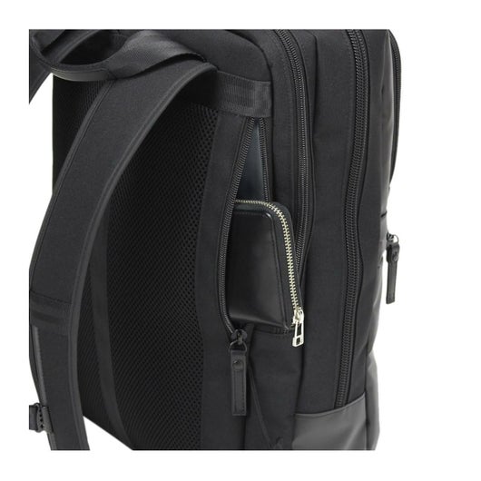 小物収納に便利な前ポケット、メインルーム、背面モバイル収納と別れておりメインルームにはビジネスツール収納がしやすいメッシュポケットや小物ポケットがついています。背面にはPCなどのデジタル機器のためのクッションポケットを備えています。背面側には貴重品などの収納に便利なポケット、サイドのファスナーからボトルを収納でき内部とつながっています。