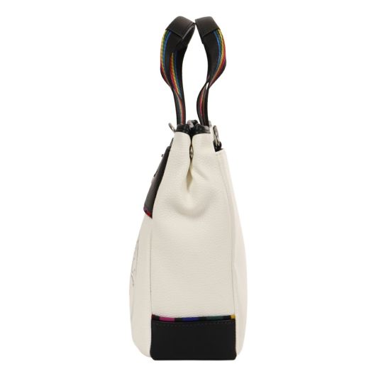特殊なメタル表現とブランドアイコンであるマルチストライプをジャガード生地に施した「JUNE」シリーズ。シボ感のハッキリとしたシュリンク調合皮を使用。PVCをベースにしてトップをPUで仕上げた耐久性が高く、加水分解のしにくいのが特徴。ブランドを象徴するレインボーカラーのオリジナルジャガート生地を先染の凹凸のあるグログランで織り上げ、価値観と個性をより高めます。凹み部分に金属調シリコンを埋め込む様な手法で、フラットさを表現する小技も見逃せないポイント。