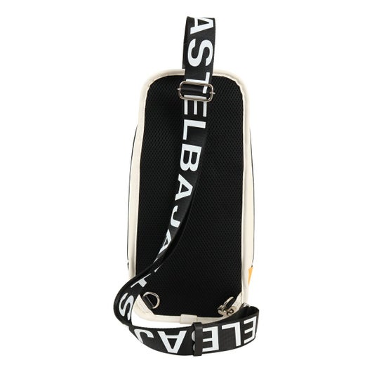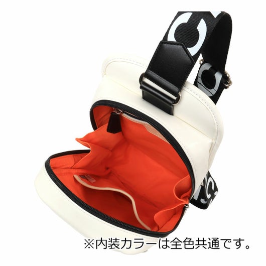 大きな盛り上げブランド家紋が目を引く、カステルバジャックのワンショルダーバッグ。赤色のファスナーや、底面のアカ・グリーン・イエローの鮮やかなブランドカラーがアクセントとなっており、バッグ全体が一層際立つデザインとなっています。