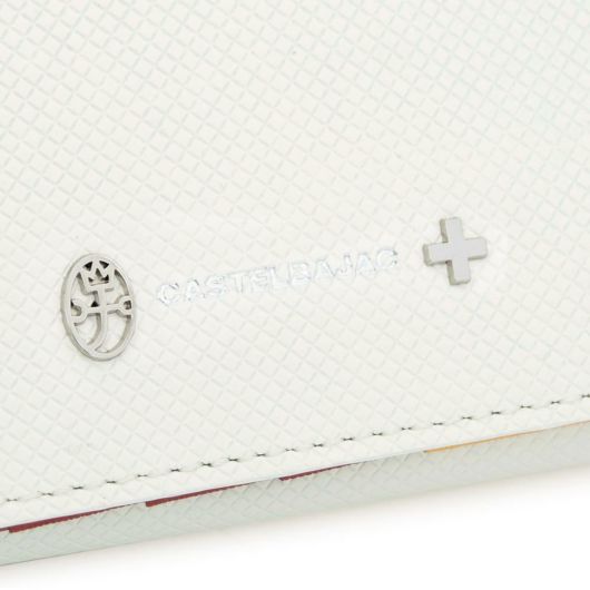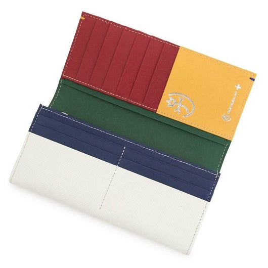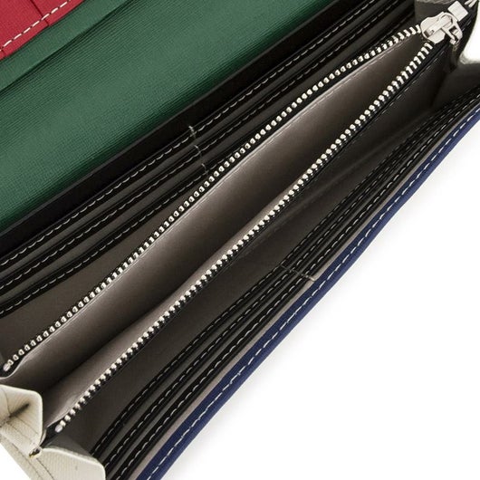 格子柄のエンボス加工を施したレザーを斜めに使用することでバジャックらしいPOPな雰囲気のダイヤ柄を表現しています。ツヤ感とカラー濃淡による2トーンでの表現をして、マテリアルの奥行き感、立体感を出しています。内装には、上品なイメージの細かいエンボス加工を施したレザーを使用して、バジャックカラーである4色えおインパクトアルブロック状のコンビネーションで使用しています。