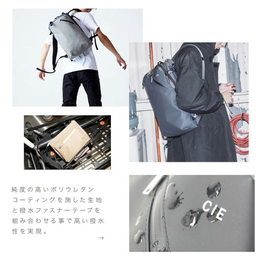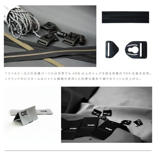 ※本体生地の防水性につきましては生地自体の防水機能となりますので、縫製部分、ファスナーから水が浸入する事がございます。本体生地の特性上、油分を含む汚れ等が付着しますととれにくい場合がございますのでお気をつけ下さい。