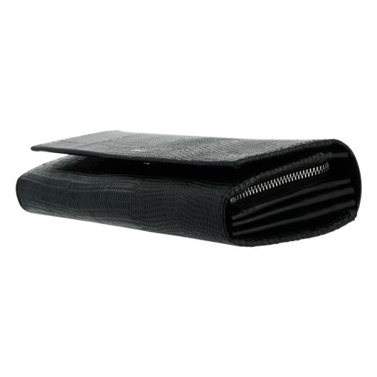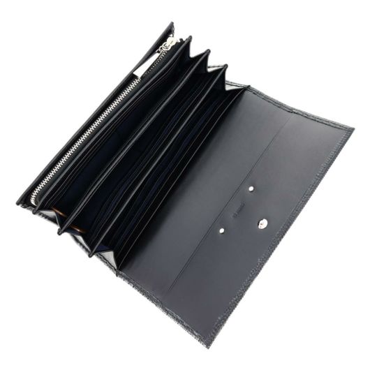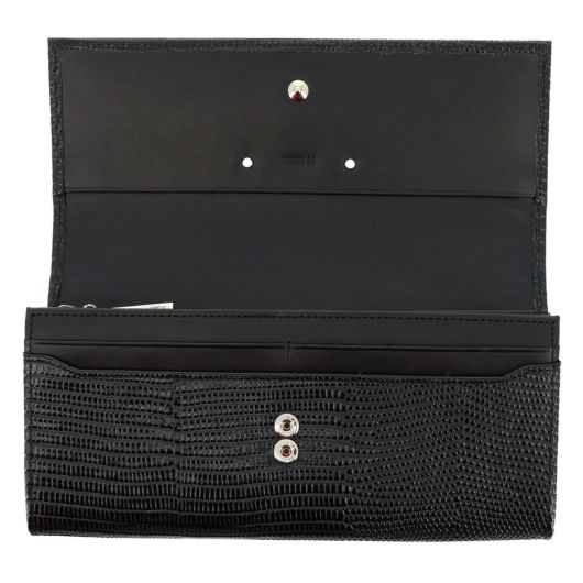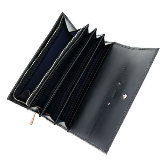 キレイな色目に仕上げたリザードの型押しと、ニュアンスが違う色目の内装のスムースの合わせが上品で洗練されたデザインです。主張しすぎないシルバー押しのロゴと、ニッケルの引き手、さりげなくあしらった小さいカシメが品と爽やかさを感じさせます。機能的ですが、全体的に薄くすっきりとしたつくりに仕上げました。