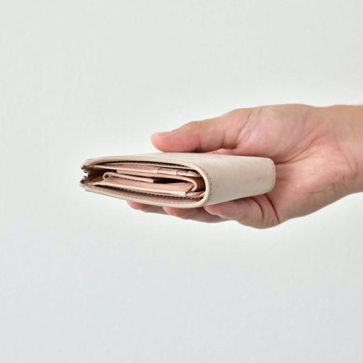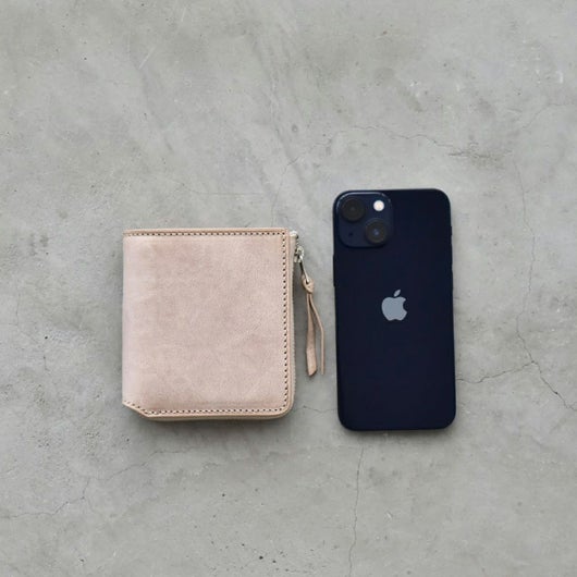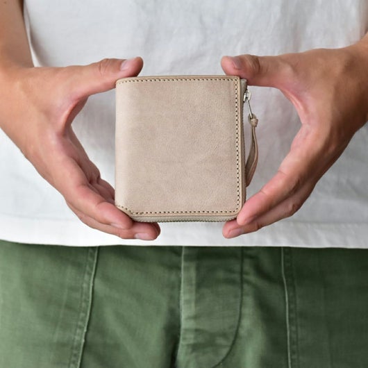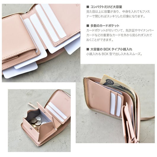 収納力たっぷりの手の平サイズ。コンパクトなサイズ感と収納力を兼ね備えた、L字ファスナータイプの二つ折りです。見た目以上に容量があり、中身を入れてもファスナーで閉じればスッキリした印象になります。札入れの部分にはカードポケットが付いていて、免許証やマイナンバーカードなどの重要なカードを外から見られず入れておくことができます。小銭入れもBOX型で出し入れもスムーズ。