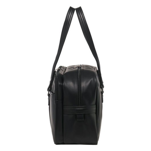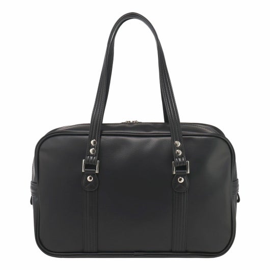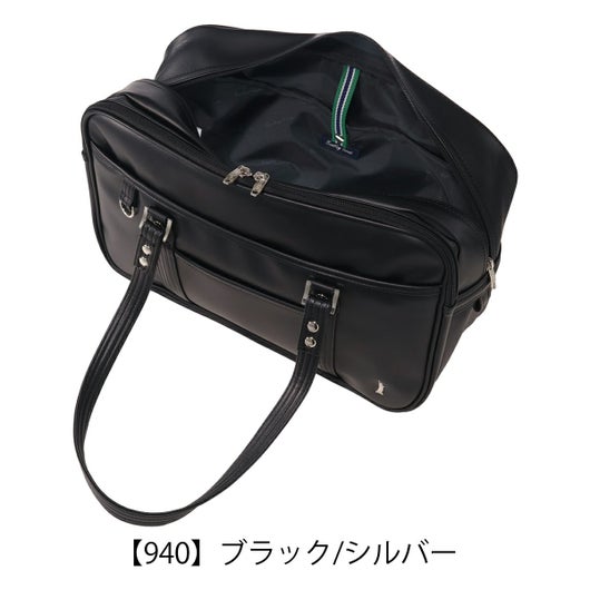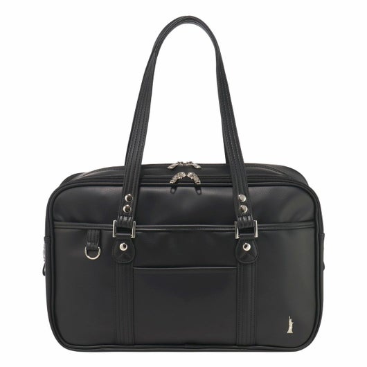 ダブルファスナーのスクールバッグ。合皮の表面はシボ感があり多少の傷も目立ちにくく高級感があります。女神刺繍は〈ヴィーナス〉の証のシルバー色、裏地はブランドネームのプリント入り。底鋲もシルバーです。A4サイズも収納でき、収納力抜群。折りたたみも可能な底板が内蔵されているので、用途によって立てたり敷いたり出来ます。