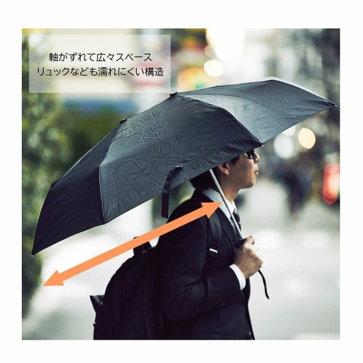シェアリー最大の特徴である中心軸がずれていることで、持ち手の逆側を広く差すことが出来るので濡れやすさを解消します。リュックを背負っている時や抱っこひもを使って赤ちゃんを抱っこしているときの急な雨など、広い面を前にすることによって雨から守ることができます。