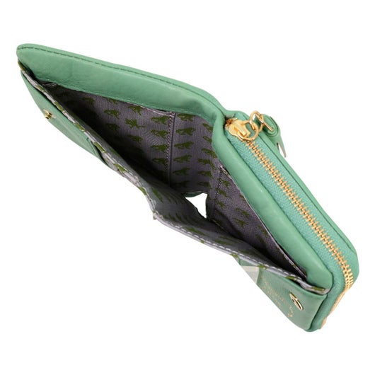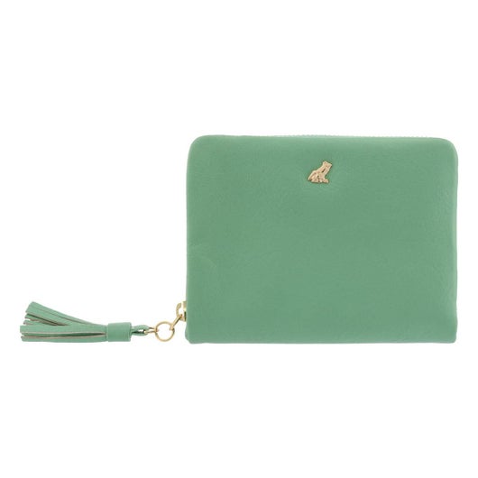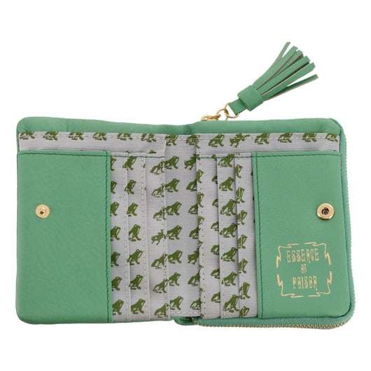 外側にラウンドファスナーの大きめな小銭入れがついた二つ折り財布です。革が柔らかいので、カードなどを入れるとちょうどよい張り感が出ます。