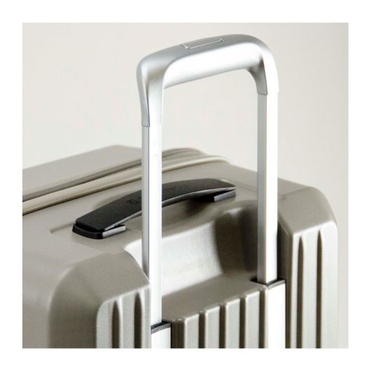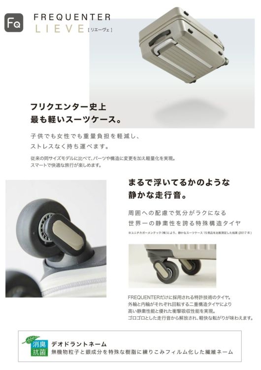フリクエンター史上、最も軽いスーツケース。子供でも女性でも重量負担を軽減し、ストレスなく持ち運べます。各部のパーツにオリジナルロゴを刻み、シンプルデザインです。ハンドル下には手の入れやすいへこみをつけ、TASは鍵の不要なダイヤル式を採用するなど、細部にわたりこだわっています。デオドラントネームを内装に縫い付け、内部の消臭・抗菌効果も。まるで浮いてるかのような静かな走行音。周囲への配慮で気分がラクになる世界一の静粛性を誇る特殊構造タイヤを採用しています。