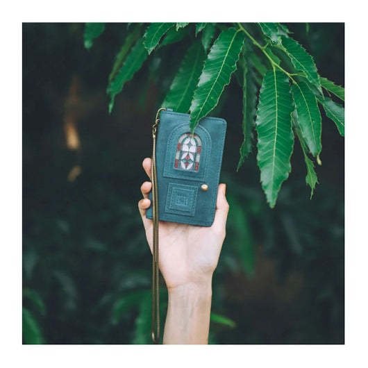 持ち運ぶオブジェのような、ステンドグラス調のリアルガラスと本革の融合させた作品。アンティークなドアを象ったデザイン。オイルを含んだ牛革は、劇的な経年変化をもたらし、お使いいただいた方だけのヴィンテージドアへと変化します。革や芯材などは類似の商品と比較し、倍近い種類とパーツ数。組み立てにおいては、微細な誤差で表情が大きく変わってしまう為、限られた熟練の職人のみが生み出すことのできる希少価値の高い作品です。完成までに約2年をかけた、最高傑作です。