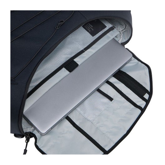 トップのポケットにはメッシュインナーポケット、フロントにアウターなどを固定できるドローコード、右サイドには水筒を入れられるストレッチポケットなど実用的なギミックが搭載。クッション性の高い背面パネルは、凹凸を設けて通気性を高めています。