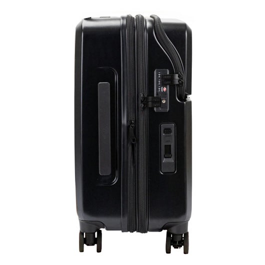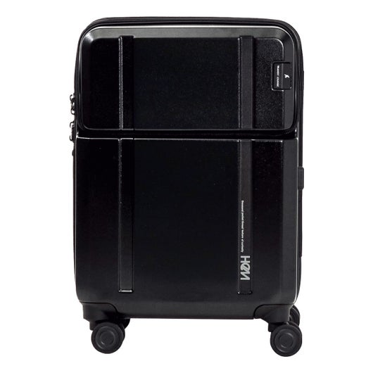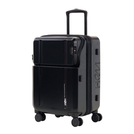 HeMとTRANSIT LOUNGEのコラボキャリー。スタイリッシュなデザインをブラックでまとめた各部パーツが引き立てます。抜群に使いやすいトップオープン型だから荷物の出し入れが簡単!ストッパーは前輪2輪がロックされるタイプで、ロック状態のまま後輪だけを引いた2輪走行が可能です。更に拡張機能付きで、荷物が急に増えても安心です。