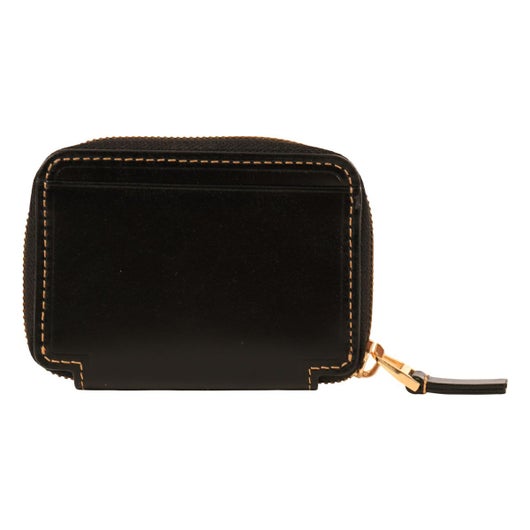シャープで上品な通夜感が魅力のスムースレザーに、ゴールド色のミニブローチとファスナーが特徴のラウンド小物シリーズ。ゴールドカラーを主張する太エレメントファスナーや断面に傾斜をつけた極小ブローチが小さいながらも主張のあるポイントになります。ヘビタンで鞣された肌目の詰まったスムースレザーをタンナー独自の特殊な手法で艶感をだし、裏地には上質なゴールド色の起毛生地を使用して価値観を高めています。
