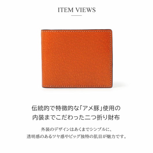 植物タンニン鞣し革を染色した後、グレージングで飴色に仕上げており、透明感のあるツヤ感やピッグ独特の肌目が魅力になります。