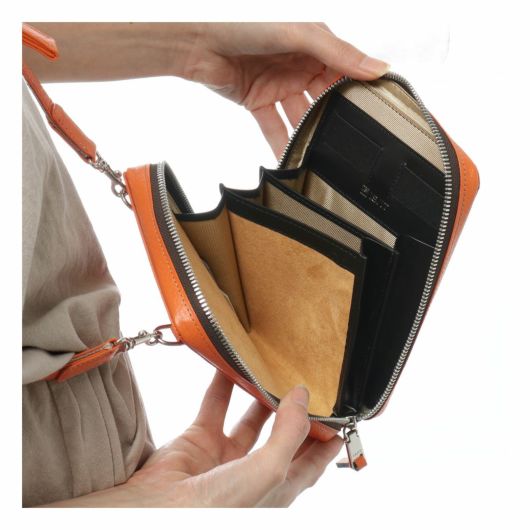 中のつくりにこだわり、見た目はコンパクトながらも、内装が3室仕様のイズイットのミニショルダーバッグです。スマートフォンを収納するために、内装生地にはソフトな起毛素材を採用しています。身軽で出かけたい人におすすめしたいアイテムです。