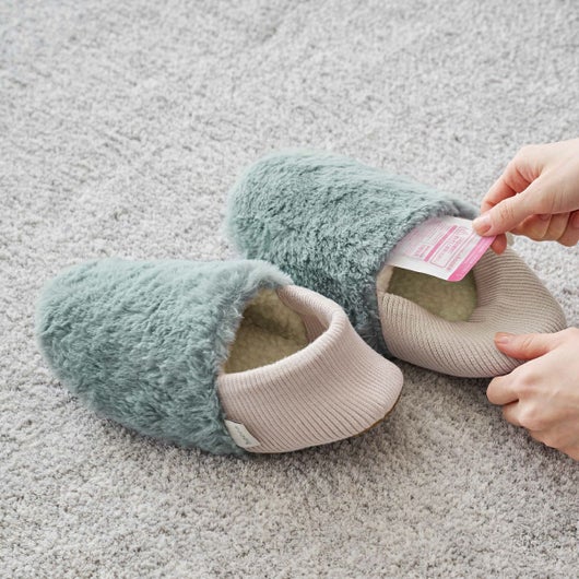 電子レンジで温めたジェルパックをポケットに入れて使用するスリッパです。心地よい温度で足元をじんわり温めます。