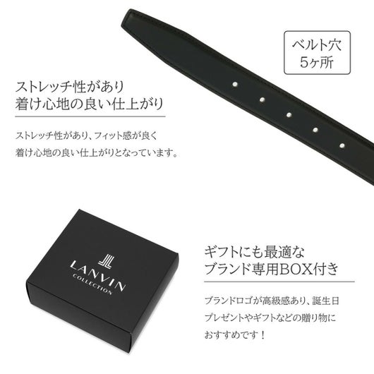 表面はスムースレザー、裏面はエンボスレザーを使用したリバーシブルタイプのベルトです。それぞれ、ブラックスムースレザー×チョコエンボスレザー、チョコスムースレザー×ブラックエンボスレザーのリバーシブル仕様になっています。シャープなデザインのバックルに、ランバンコレクションのロゴをレザー彫りで表現しました。幅広いシーンにマッチするコーディネート力抜群のアイテムです。