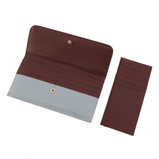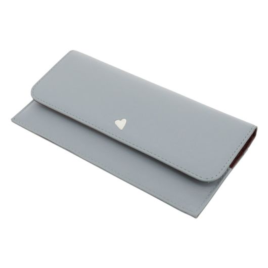 小さなカッティングハートをランダムに飛ばしたシンプルなデザインながらも遊び心があるシリーズです。ハート型にくり抜いたところに別の色のハートをパズルのように埋め込んでいます。埋め込んでいるのでさわり心地がフラットで、革も滑らかなのが長所です。グレーとブルーは内装とカラーコンビになっています。