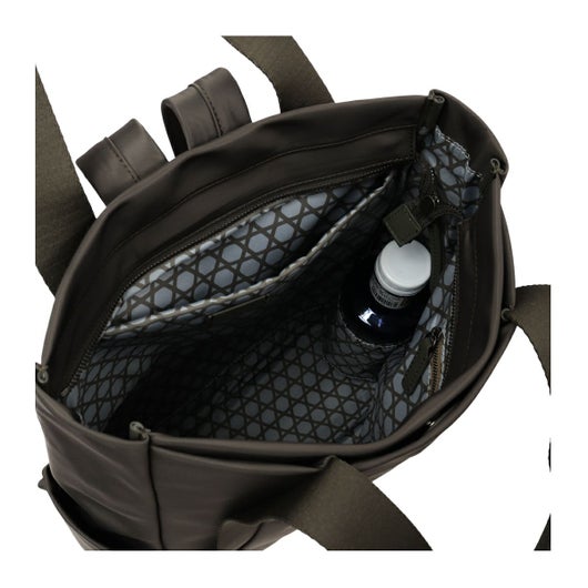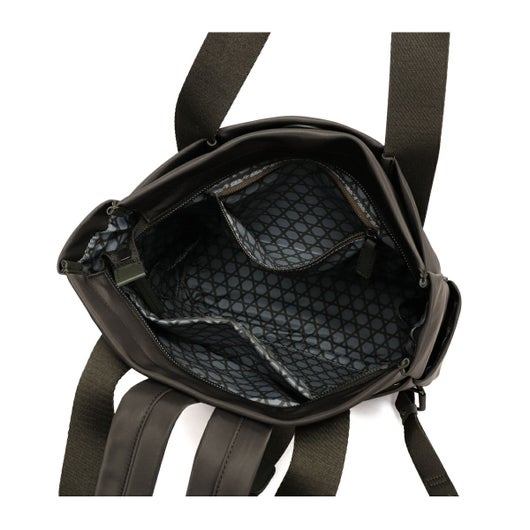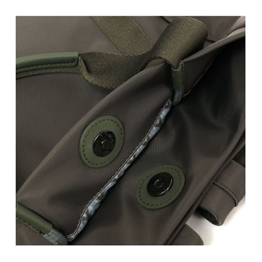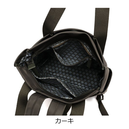 幅広のテープ使いが印象的なシンプルデザインの本体は高密度ナイロン素材を使用し裏地に「籠目柄」をプリント。