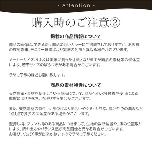備考 |●天然皮革のため、摩擦や水分付着により色落ち、色移りすることがありますのでご注意ください。水などで濡れた場合は、柔らかい布で叩くようにして十分に水分を取り陰干してください。