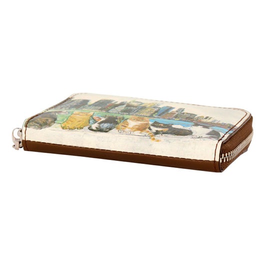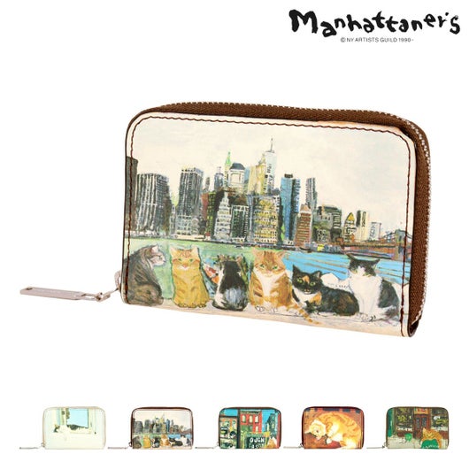 画家久下貴史氏が猫たちとのニューヨーク暮らしから描き出す、個性豊かであたたかく美しいブランド“マンハッタナーズ”のミニウォレットです。可愛い猫が描かれ普段使いやデートなど様々なシーンでの使用が楽しくなるアイテムです。マチも大きく開くので中の小銭なども出し入れしやすくなっています。