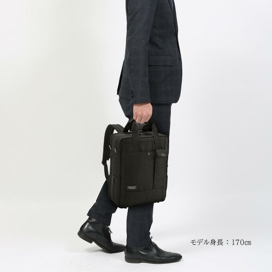 鞄の中が見易いシルバーカラーの内装、底鋲、背面ショルダーストラップ収納ポケット、大きく開くL字ファスナー等。2種類の生地を使用したコンビネーションデザインと洗練されたフォルムが秀逸な2ルームリュック。