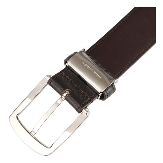 エンボスレザーを使用しています。バックルの先端部分には、ミラ・ショーンの象徴の柄でもあるシェブロン柄をさりげなく刻印しています。3.5cm幅のやや太めなベルトなので、休日のジャケットスタイルからビジネスシーンまで、幅広いスタイルにマッチします。ベルトをお好みの長さに調整できるよう、バックルには中間フリー金具を使用しました。金具を外してお好みの長さに切断することでご自身にあった長さに調整することができます。贈り物としても最適なアイテムです。
