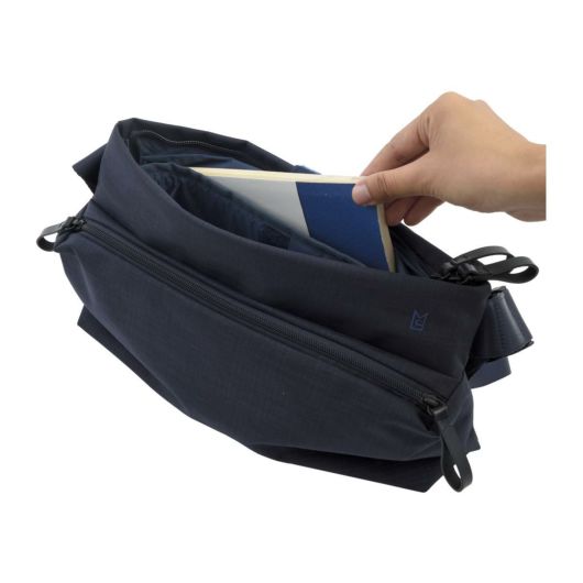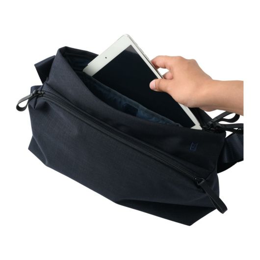 シーンを選ばず、持ちやすいショルダーバッグ。外装はシンプルながら、内装にはガジェット用のスリーブポケットや、鍵などの貴重品をホールドできるナスカン付きのロングストラップを装備。バックルにはフィドロックを採用しているので、アウターの下でも脱着がスムーズ。
