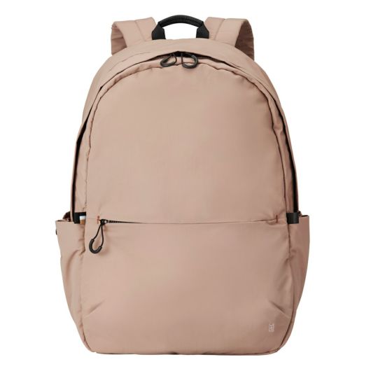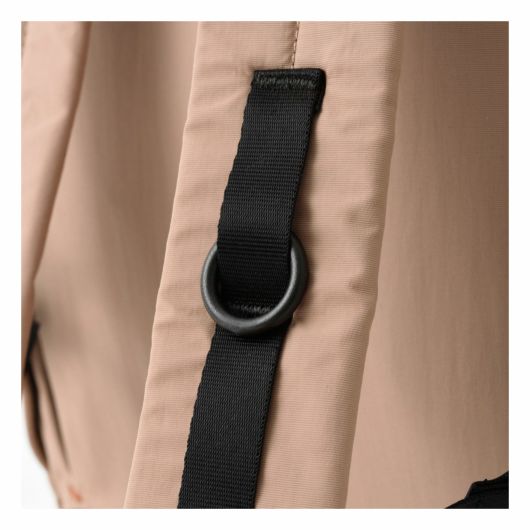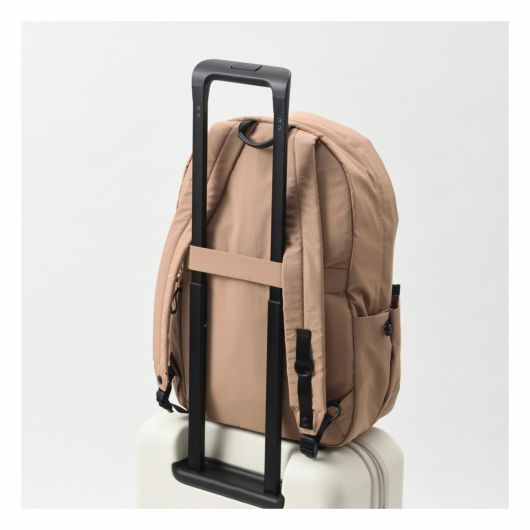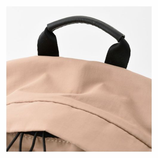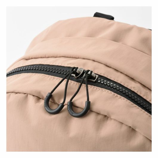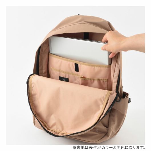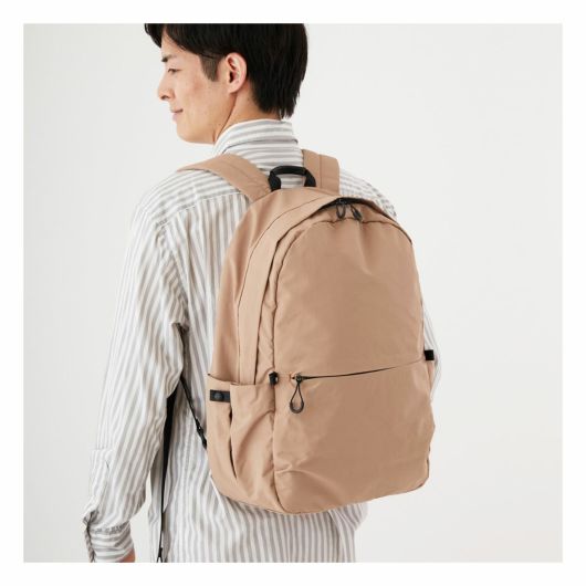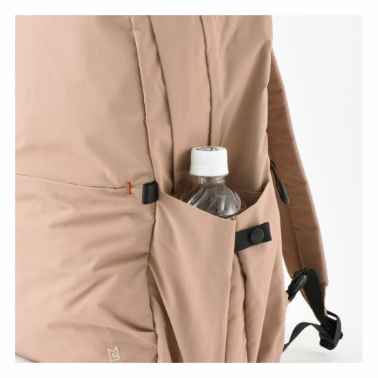 外装にはすぐ取り出したい物の収納に便利なフロントポケット、ペットボトルや傘を収納できる両サイドのポケット、背負ったまま物を出し入れできる背面のファスナーポケットを搭載し、ミニマルなデザインとは裏腹に使い勝手を考え抜かれたポケットの配置が魅力です。