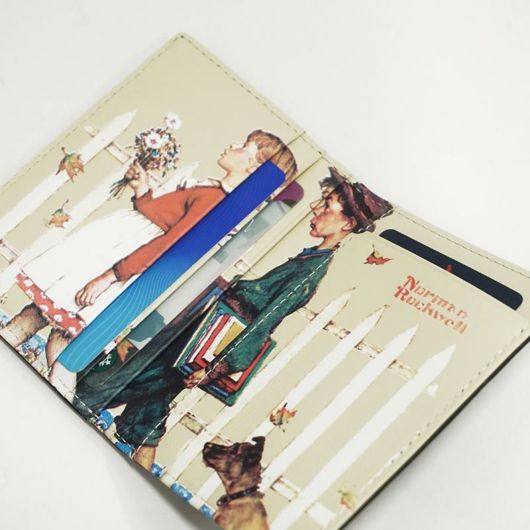 ノーマンロックウェルイラストシリーズ 20世紀のアメリカ合衆国の画家、イラストレーター。軽いタッチでアメリカの市民生活を描き、アメリカでは幅広い大衆的人気をもつ。ニューヨークで生まれ、美術学校を出てから、アメリカ・ボーイスカウト協会の雑誌などに絵を書き始める。彼の絵は1916年から1963年にかけて『サタデー・イーブニング・ポスト』紙の表紙を飾ったが、とりわけ1940年代から1950年代のものが人気があるようです。彼の絵は商業主義的で一部の近代美術批評家からはまじめな画家とは扱われず、イラストレーターと呼ばれることもあるが、アメリカの市民生活の哀歓を巧みに描き、アメリカ人の心を捉えているため、最もアメリカ的な画家のひとりともいえる存在だといいます。 ノーマンロックウェル氏のイラストを、そのままデザインに落とし込んだシリーズ。 開いた面にはカード段が4段あり、裏面にパス窓を配置し定期券や免許書を入れられます。 ノーマンロックウェルの愛らしい絵柄がいつでも心を和ませてくれます。プレゼントにもおススメです。