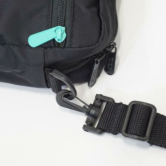 フロントのファスナーポケットはパスなどの出し入れの多い小物の収納に最適です。