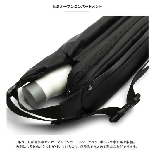 【コンパクトでも収納力抜群】取り出しが簡単なセミオープンコンパートメントでペットボトルや傘を楽々収納!内側にも多数のポケットが付いているので、必需品をまとめて運ぶことができます。