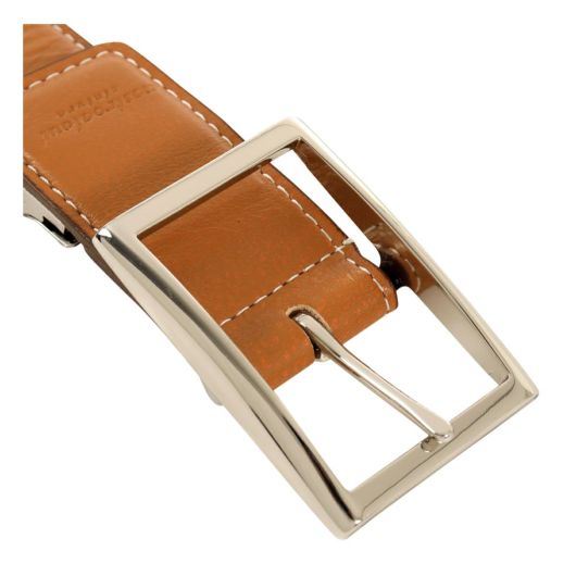 バックルのピン先をストレートにすることで、バックルを180度回転させて帯を裏表両方使えるリバーシブルベルトとしてお使いいただけます。ステッチは表革には生成りスッキリした印象に、裏革には共色のステッチを施しカジュアルな印象に仕上げています。その日のコーディネートに併せて瞬時に色を合わせらることがポイントです。