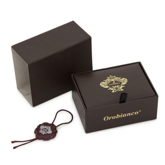 オロビアンコとは、イタリア語で“白金”、“貴重なるもの”という意味。ジャコモ氏がチベットを旅している際、現地人がカシミヤを“ホワイトゴールドと呼び、敬意を持って取り扱っている事に感銘し、「ORO(金)」「BIANCO(白)」=『OROBIANCO』と命名。ロゴの中央にいる動物は、このカシミヤヤギがモチーフになっている。