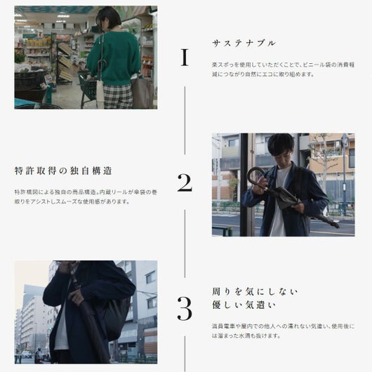 傘をシュルっと入れてスポっと取り出せる便利な傘収納ケースです。特許構図による独自の商品構造。内蔵リールが傘袋の巻き取りをアシストし、スムーズな使用感。濡れた傘も簡単に収納でき、バックなどに付けられるフックと肩掛けできるストラップ付きで傘を使用している時もしていない時も持ち運びに便利です。満員電車や室内での傘マナー向上、お子様の登下校時、通勤にも活躍します。先端はスナップ仕様で、溜まった水も簡単に抜けます。サイズ展開は2種類で様々な傘のタイプに使えます。
