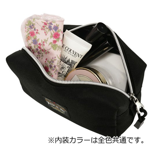 シンプルで使いやすいデザインのポーチが登場。軽量なポリエステル素材を使用。裏地はロゴ入りのドット柄。キュートな3匹の猫のアクリルキーホルダーは取り外し可能なのでお好きな場所に付けていただけます。