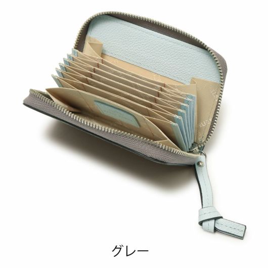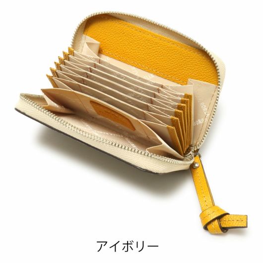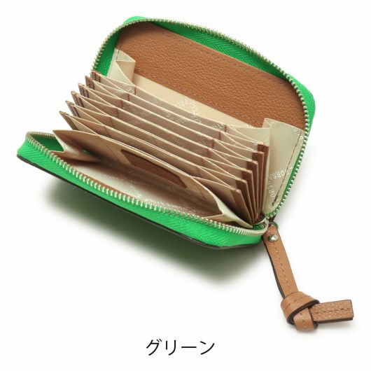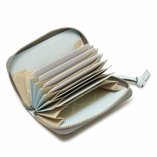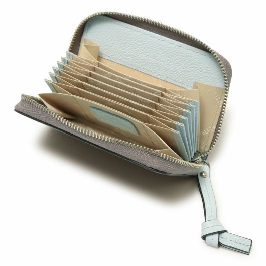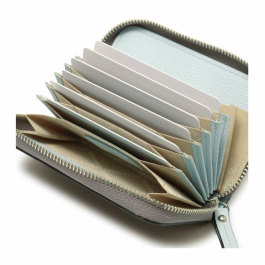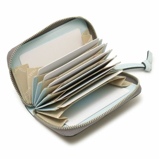蛇腹仕様のカードケースです。両端のポケットはマチ付きで広くなっているので、それぞれ小銭とお札(四つ折り)を入れてコンパクトなお財布としてもお使いいただけます。