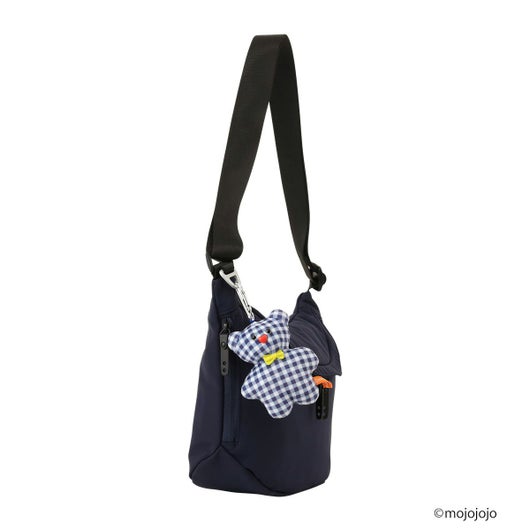 mojojojoコラボのオリジナルチャーム付きラウンドショルダー(S)。ブルーチェックのボディに、イエローのボウタイを付けたBOYNAカラーのくまちゃんチャームを特別に制作しました。ハート型のお鼻もさりげないアクセントです。