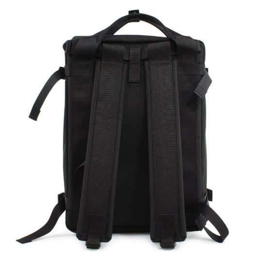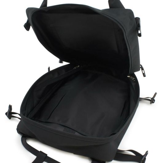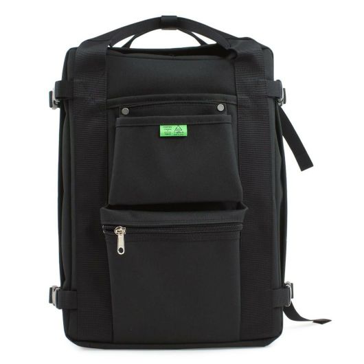 コットンよりも軽量で、色落ちがしにくい特性のあるポリエステルキャンバス生地を使用したリュックタイプのシリーズ。ワークウエアや工具用腰袋をモチーフとしたフロントポケットは、リベット使いと印象的なグリーンカラーのネームタグ(グレーとネイビーは本体と同色のタグ)がポイント。