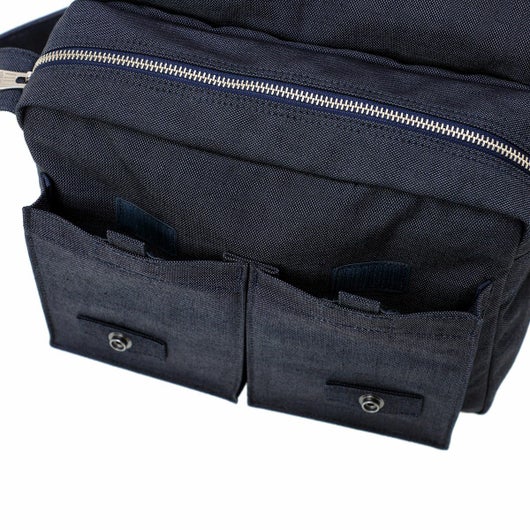 こうして生まれた「コーデュラ(R)ダック」は、コットンのもつ優しさやナチュラルな表情とナイロンの持つ強さや光沢による、これまでの織物にはない独特な風合いが魅力です。ローテクとハイテクが融合したこの生地は、タテ糸とヨコ糸で差を出して染色することで、奥ゆきのある味わい深い色に仕上げています。