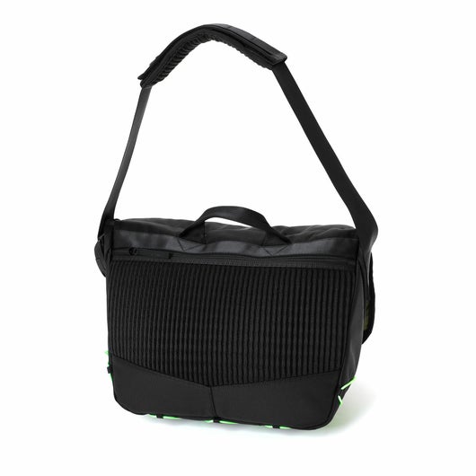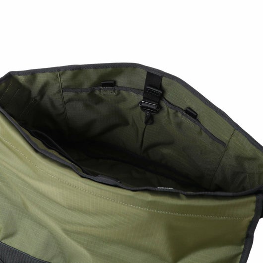 メッセンジャーバッグは大容量のメイン収納部内に、14inch のPCを収納できるクッション材入りのポケットを設けています。背面のファスナーから内装に直接アクセスができる仕様のため、フラップを開けなくてもPCを直接取り出すことが可能です。口元部分に取り付けたナスカンは、カバンの形を整えるとともに衝撃などで収納物が外に飛び出すことを抑える役割があります。