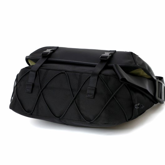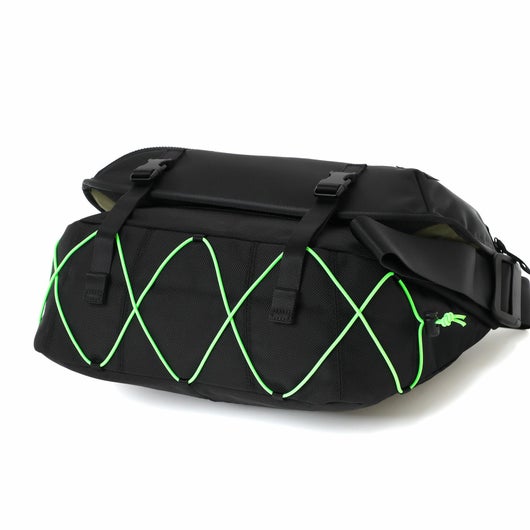 背負った時に目を引く底部のストレッチコードは伸縮性があり、衣類や折り畳み傘などを 簡易的に収納するのに便利な仕様です。各アイテムには、ビジネスシーンにも対応するブラックとスポーティーな印象の蛍光グリーンの2色のストレッチコードが付属し、気分によって付け替えを楽しんでいただけます。