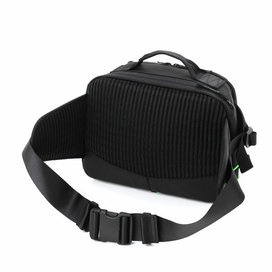 ウエストバッグは11inchのiPadが収納可能なメイン収納部に加え、内装に小物の整理に便利な仕切りポケットを配した収納部を備えています。上部にハンドルを取り付け、手持ちや荷物を取り出すときの支えとしても使える汎用性の高い仕様です。