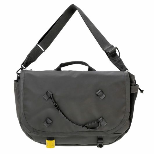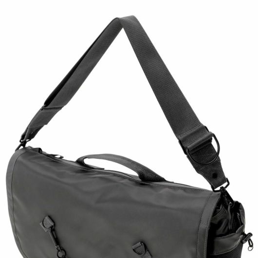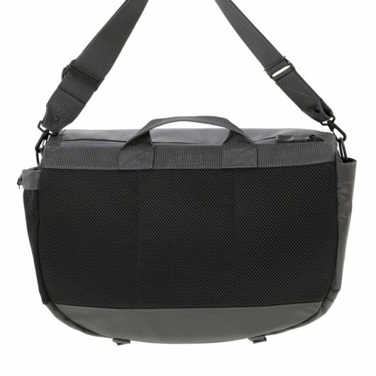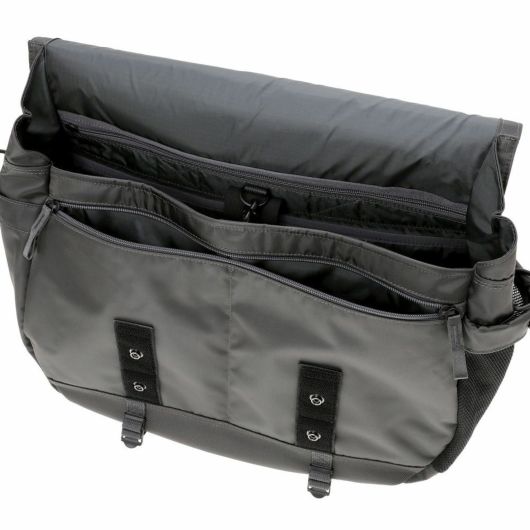 メッセンジャーバッグは大容量のメイン収納部と、内装に16inchのPCを収納できるクッション材入りのポケットを設けています。サイドポケットには600mlのペットボトルや折り畳み傘を収納することができます。背面側の上部にファスナーを設けることで内装に直接アクセスできる仕様で、フラップを開けなくてもPCや荷物を取り出すことが可能です。また、収納部の口元部分を金具で留めることができる仕様のため、型崩れしにくいのもポイントです。