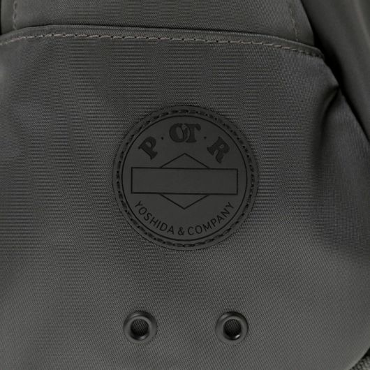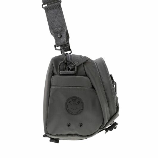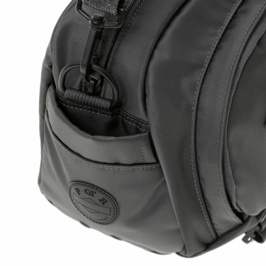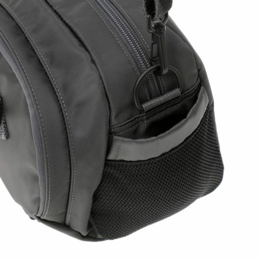 メイン素材にナイロンツイル生地を使用しており、PVC加工を施すことで耐水性を高めています。負荷のかかりやすい底マチ部分にはコーデュラバリスティックナイロンを採用し、耐久性も上げました。本体の前面や底面に身の回りのものを簡易的に固定して持ち運ぶことができるスリングバインダーも配しています。バックパックやウエストバッグはテープをクロスさせることで、見た目のアクセントにしました。ショルダーストラップはワンアクションで滑らかな調節が可能な画期的な仕様です。