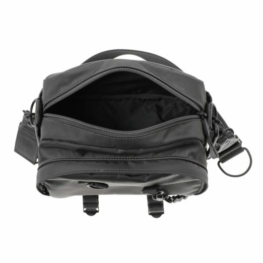 ショルダーバッグは2層式で、小ぶりながらもマチ幅があり、身の回りの必需品や350mlのペットボトルが収納できるサイズで普段使いに最適なアイテムです。メイン収納部と前層の内装に小分けに便利なポケットを設けており、細かな荷物の収納が可能です。