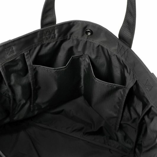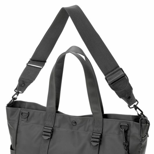 メイン素材にナイロンツイル生地を使用しており、PVC加工を施すことで耐水性を高めています。負荷のかかりやすい底マチ部分にはコーデュラバリスティックナイロンを採用し、耐久性も上げました。本体の前面や底面に身の回りのものを簡易的に固定して持ち運ぶことができるスリングバインダーも配しています。バックパックやウエストバッグはテープをクロスさせることで、見た目のアクセントにしました。ショルダーストラップはワンアクションで滑らかな調節が可能な画期的な仕様です。